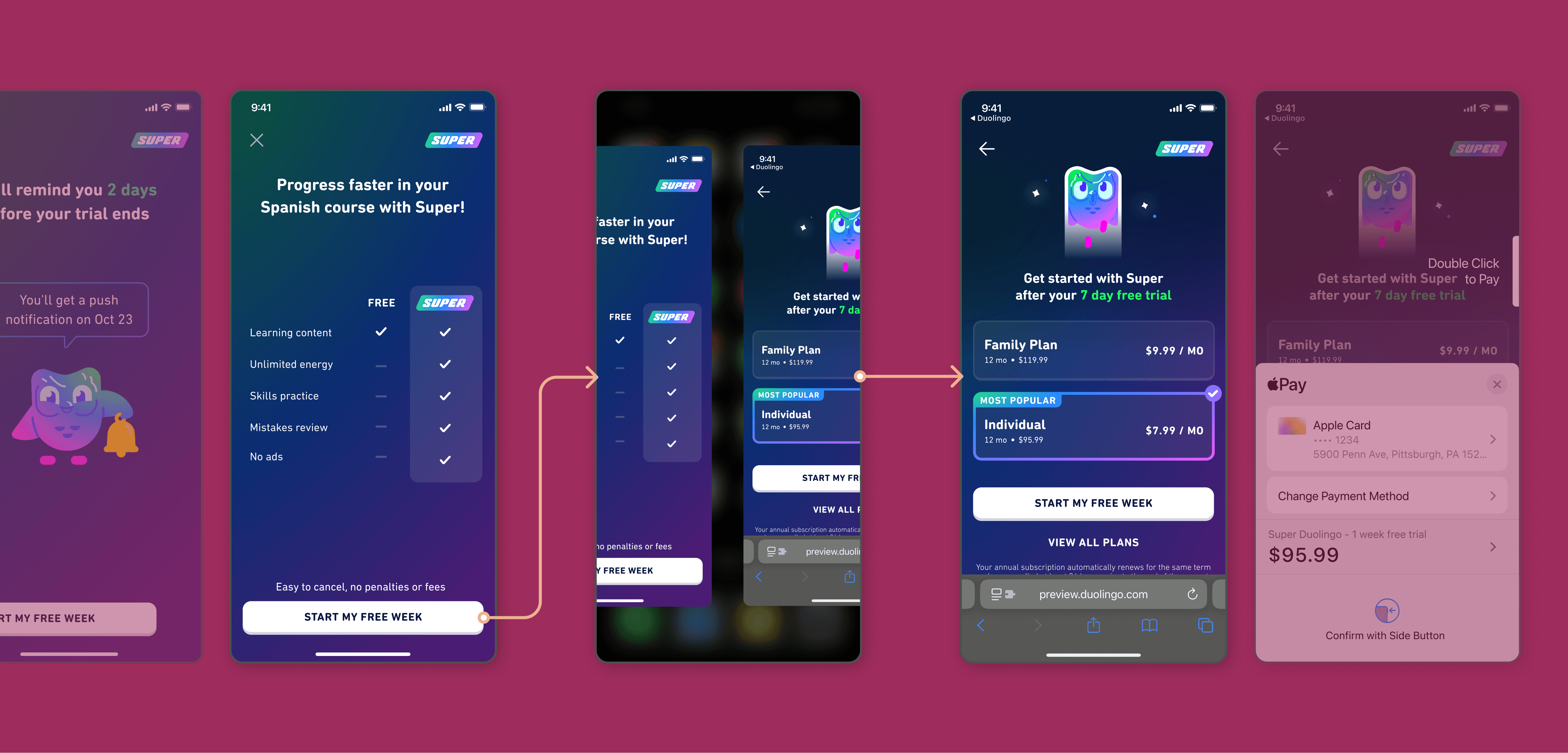 Owned end-to-end design of Duolingo’s web purchase flow for U.S. learners, from entry points through checkout and confirmation.